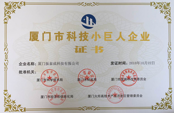 熱烈祝賀我公司廈門(mén)振泰成科技有限公司于2016年10月獲得獲得“廈門(mén)市科技小巨人”的榮譽(yù)證書(shū),謝謝廈門(mén)市科學(xué)技術(shù)局、廈門(mén)市財(cái)政局、廈門(mén)市經(jīng)濟(jì)和信息化局、廈門(mén)火炬高新技術(shù)產(chǎn)業(yè)開(kāi)發(fā)區(qū)管理委員會(huì)和廈門(mén)市發(fā)展和改革委員會(huì)對(duì)我司的高度肯定!